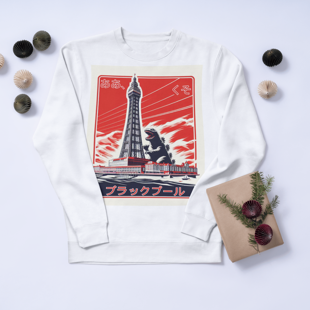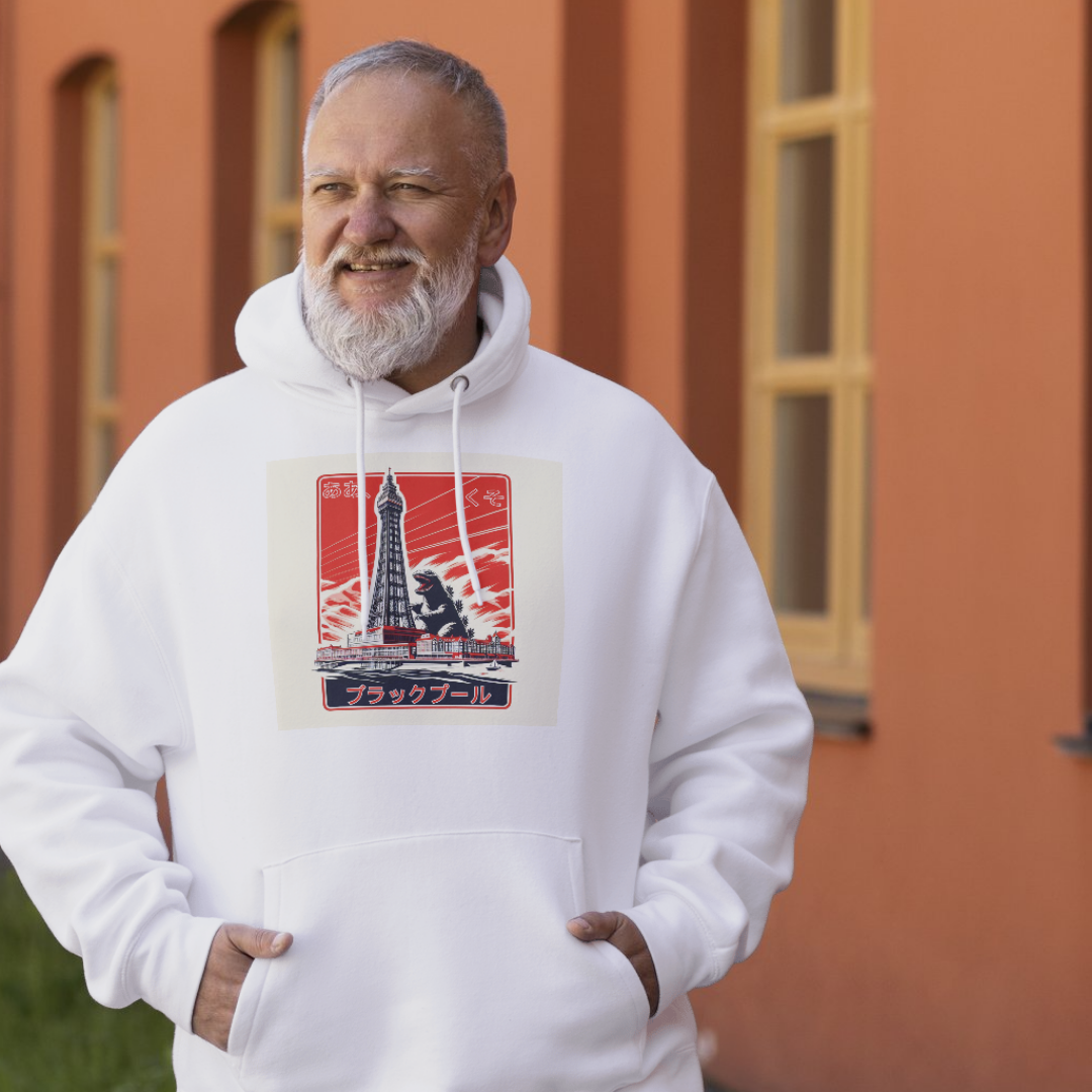 The standout feature of this hoodie is the eye-catching graphic on the front: a bold, vintage-style print of Blackpool Tower, set against a towering, menacing kaiju. The Japanese-inspired artwork, combined with vibrant red and white hues and traditional Japanese text, offers a unique, retro aesthetic that captures the essence of cinematic nostalgia. Whether you’re a fan of kaiju films, British landmarks, or just love a striking, memorable design, this hoodie has something special for everyone.