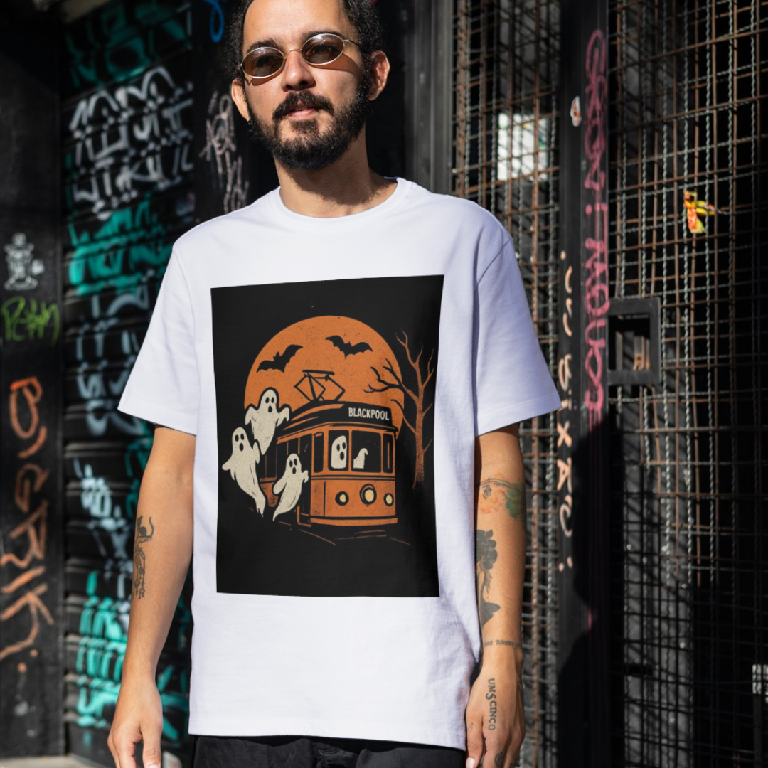 Get ready to turn heads this spooky season with the Haunted Tram Ride Blackpool T-shirt. Designed with a bold, vintage-style print, this shirt captures the eerie charm of Blackpool after dark. Featuring a ghostly tram surrounded by playful spirits, bats flying against a glowing orange moon, and creepy tree silhouettes, it’s the perfect fusion of Halloween fun and seaside nostalgia.